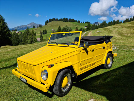 Wir fahren für Sie mit unserem liebevoll restaurierten VW 181 Kübelwagen vor – ein echter Klassiker, der mit seinem nostalgischen